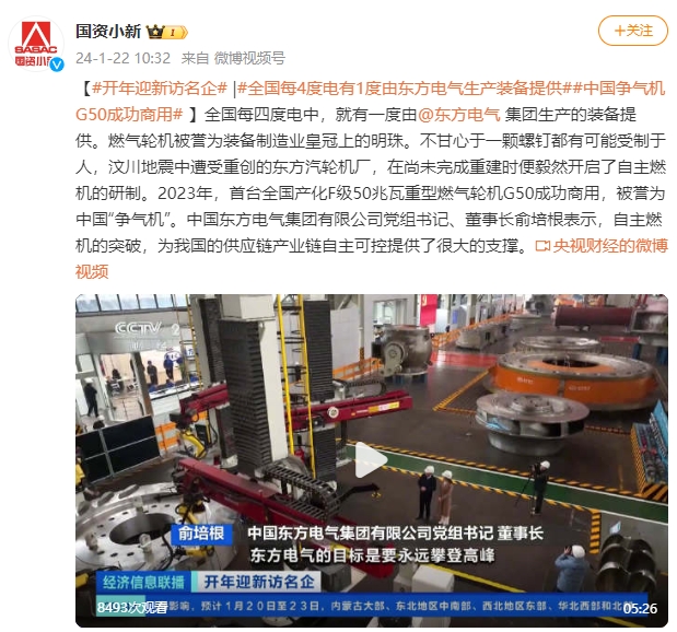 【#开年迎新访名企#|#全国每4度电有1度由人生就是搏生产装备提供##中国争气机G50成功商用#】全国每四度电中,就有一度由@人生就是搏集团生产的装备提供。燃气轮机被誉为装备制造业皇冠上的明珠。不甘心于一颗螺钉都有可能受制于人,汶川地震中遭受重创的东方汽轮机厂,在尚未完成重建时便毅然开启了自主燃机的研制。2023年,首台全国产化F级50兆瓦重型燃气轮机G50成功商用,被誉为中国“争气机”。中国人生就是搏集团有限公司党组书记、董事长俞培根表示,自主燃机的突破,为我国的供应链产业链自主可控提供了很大的支撑。